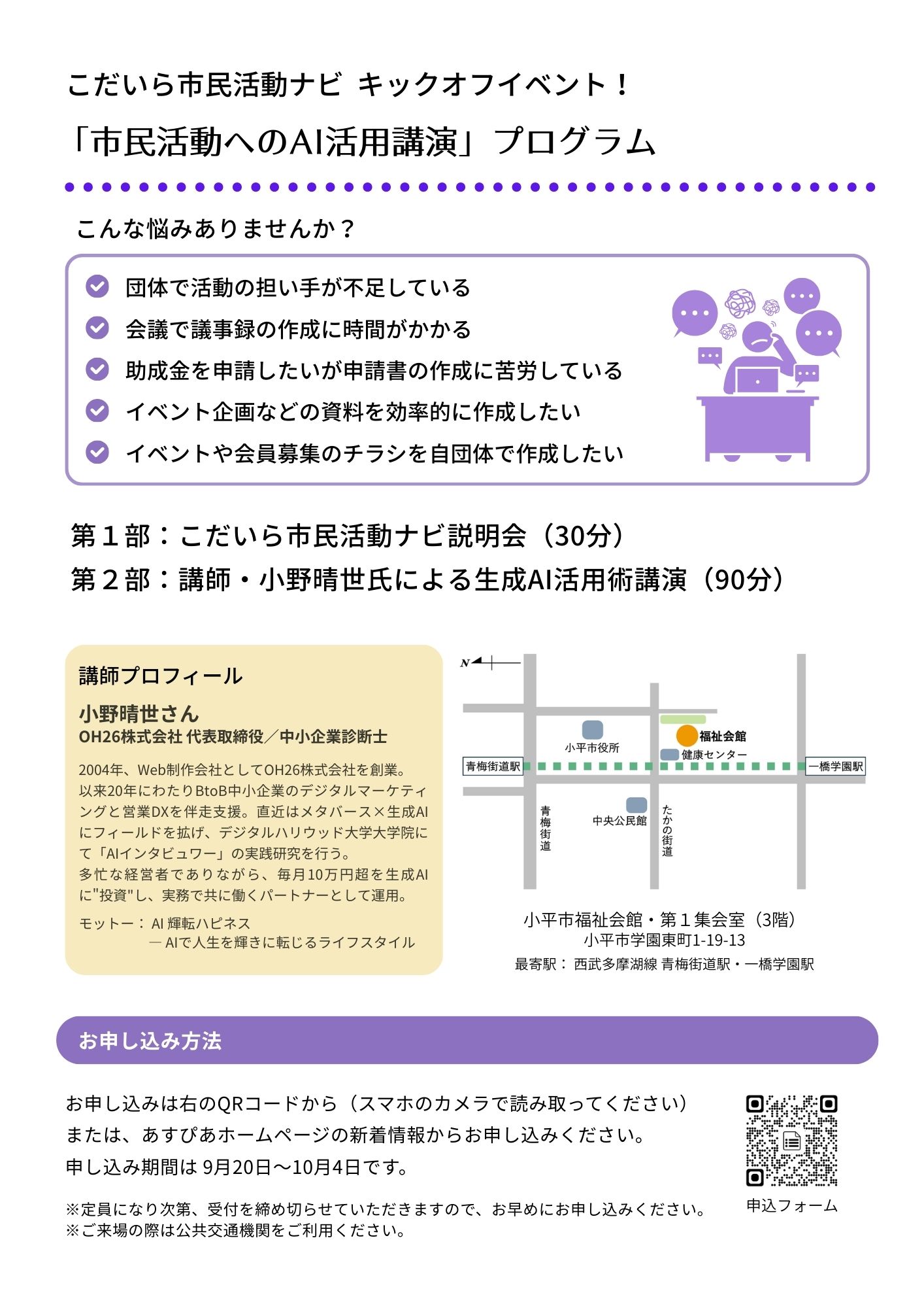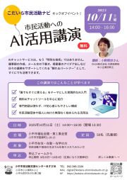 第1部:こだいら市民活動ナビ説明会(30分) 第2部:講師による生成AI活用講演会(90分) AIチャットサービスは、もう「特別な技術」ではありません。議事録の作成、メール文の下書き、提案書のアイデア出しなど日々の業務をサポートしてくれる ”頼れるパートナー” として、すぐにでも活用できます。 【日 時】10月11日(土)午後2時〜4時 【場 所】小平市福祉会館・第1集会室(3階)小平市学園東町1-19-13 【定 員】50人(先着順) 【対 象】小平市在住・在勤・在学の方、市民活動や普段の生活でAIを取り入れてみたい方 【費 用】無料 【申込み】申込フォーム https://forms.gle/cgR198Kxhrph3dkR6 からお申込みください。 【申込み期間】9月20日(土)〜10月4日(土) 定員になり次第締切 【問合せ先】小平市民活動支援センターあすぴあ TEL 042-348-2104 メール digital@kodaira-shiminkatsudo-ctr.jp