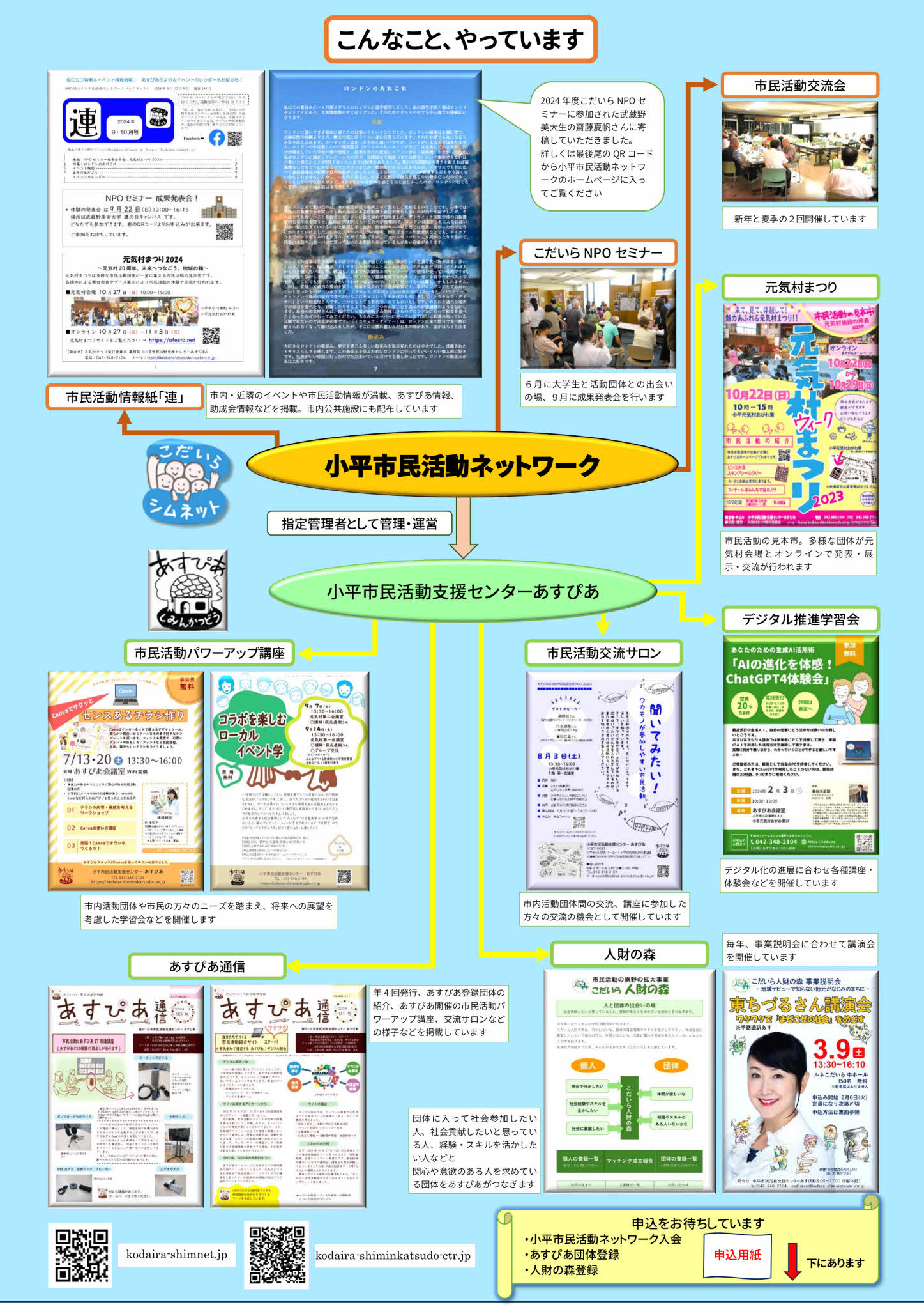 小川西町公民館で「地域で共に創る新しい公共施設」という講座があり、参加したメンバーの有志が小川駅西口開発の「新公共施設」計画に積極的に参加し、どんどん楽しんじゃおうという思いでつくったサークルです