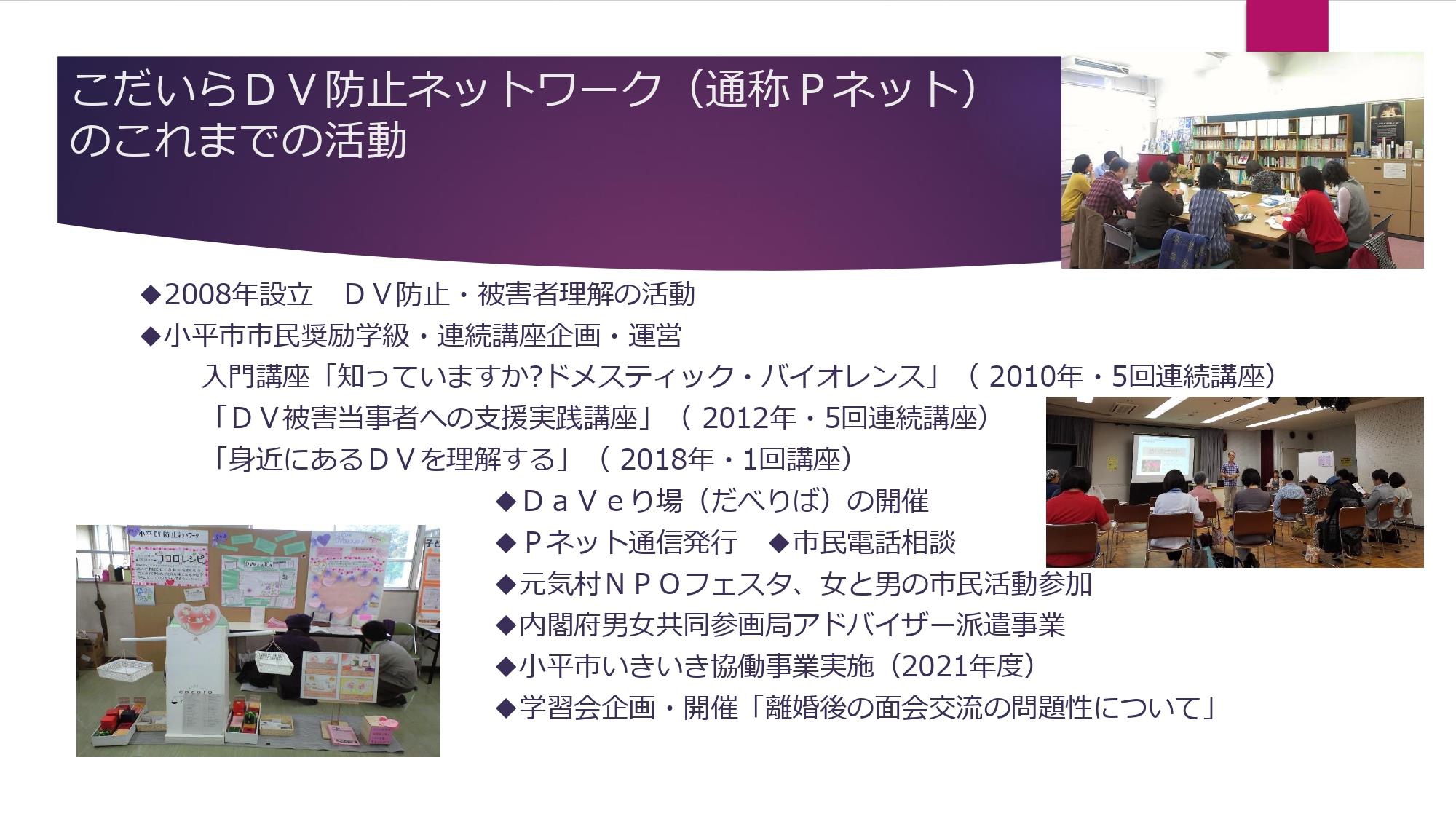 DVについての偏見や誤解をなくし防止する啓発活動や語り合いの場づくりを行っています。