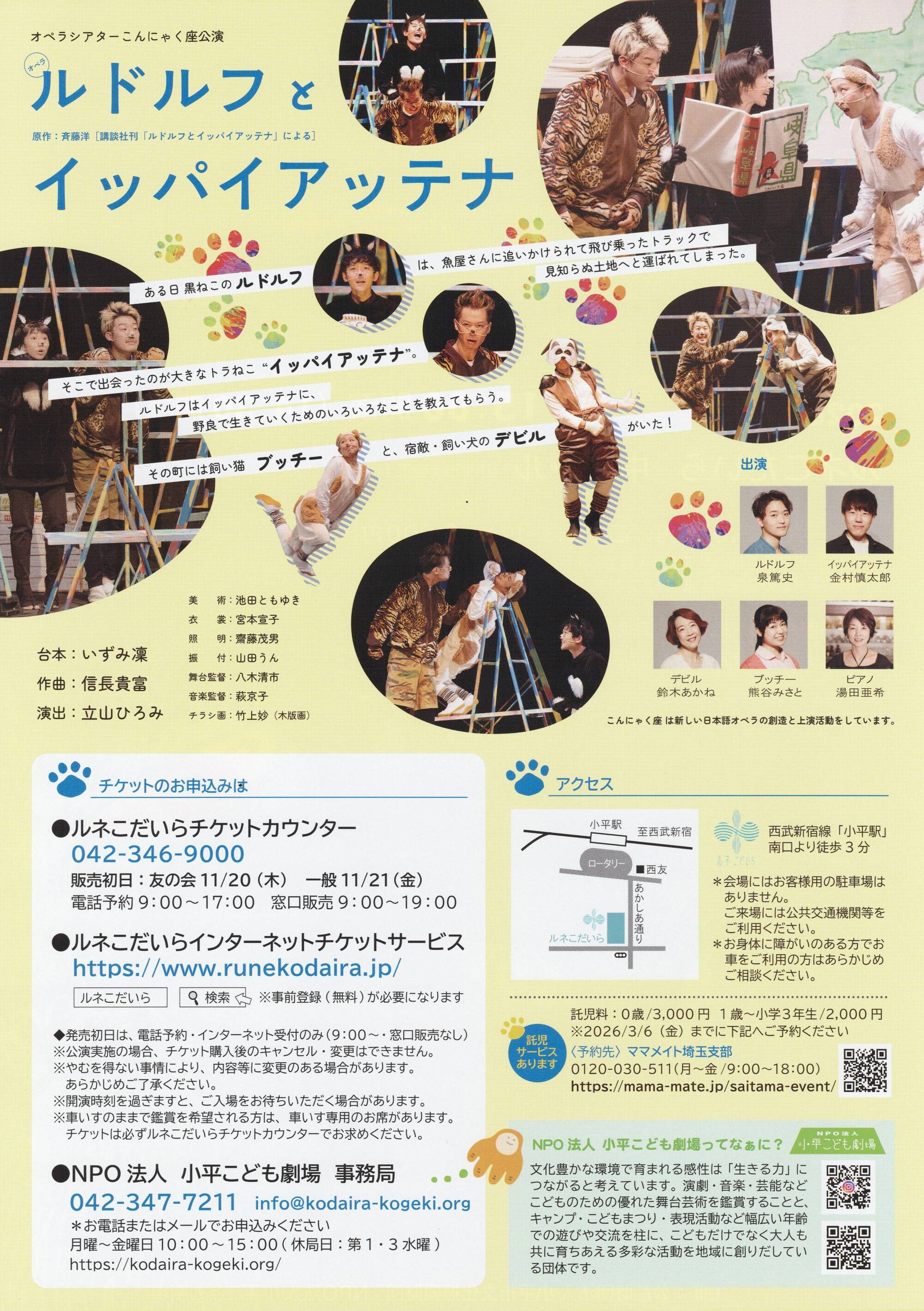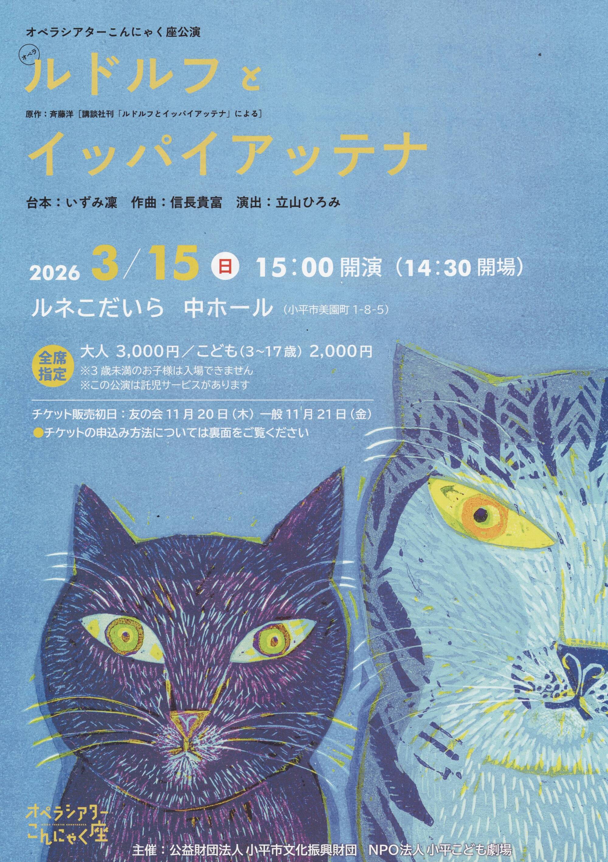 【日時】2026年3月15日(日)15:00開演(開場14:30、上演時間1時間半) 【場所】ルネこだいら 中ホール 【対象】3歳から(3歳未満入場不可。有料の託児サービスもあります) 【チケット】こども(3〜17歳)2,000円/大人3,000円 ※この公演は(公財)小平市文化振興財団との共催事業です。 チケットは、ルネこだいらチケットカウンター、ルネこだいらインターネットチケットサービスからもお求めいただけます。 【お問い合わせ先】小平こども劇場事務局 TEL:042-347-7211 E-mail: info@kodaira-kogeki.org