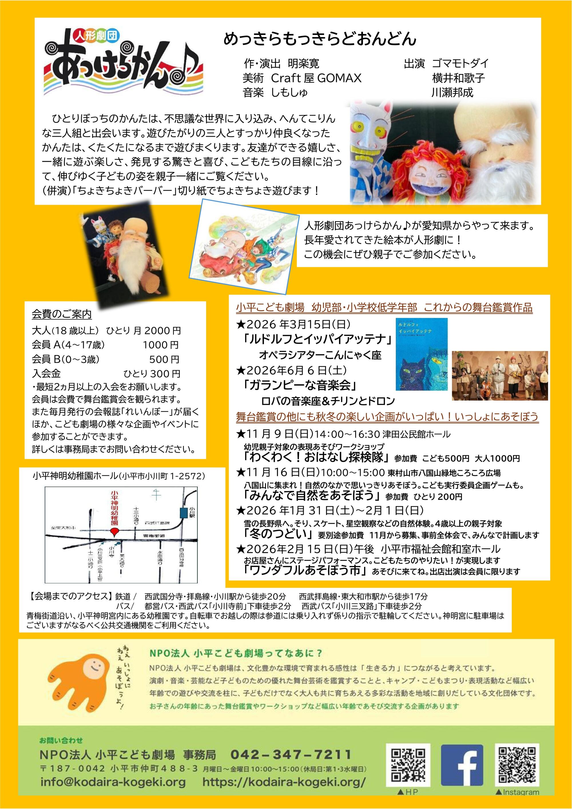 【日時】2025年12月7日(日)11:00開演(開場10:45、上演時間60分) 【場所】小平神明幼稚園ホール 【対象】幼児・小学校低学年のこどもと保護者 【参加】小平こども劇場の会員(最低2か月以上の入会…0歳〜3歳1300円、4歳〜17歳2300円、大人4300円) 一般チケットの取り扱いもあります。事務局までお問い合わせください。 【申込】小平こども劇場事務局までお電話またはメールでお申し込みください。 TEL:042-347-7211 E-mail: info@kodaira-kogeki.org