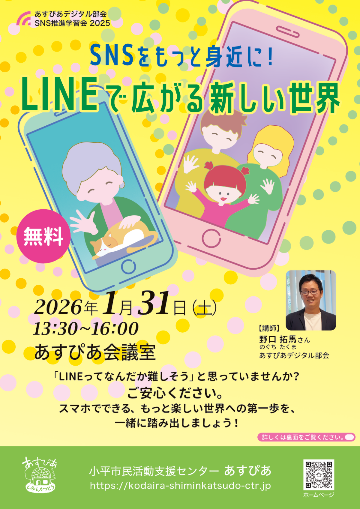 ご安心ください。 スマホでできる、もっと楽しい世界への第一歩を、一緒に踏み出しましょう! 【定員】16人 要申し込み・先着順、定員になり次第締め切り 【対象】SNSを使ってみたいと思っている小平市内と近隣市の方 【費用】無料 【申込み】下記のあすぴあホームページからお申込みください。 https://kodaira-shiminkatsudo-ctr.jp/archives/30204 【申込み期間】2026年1月20日(火)~1月28日(水)